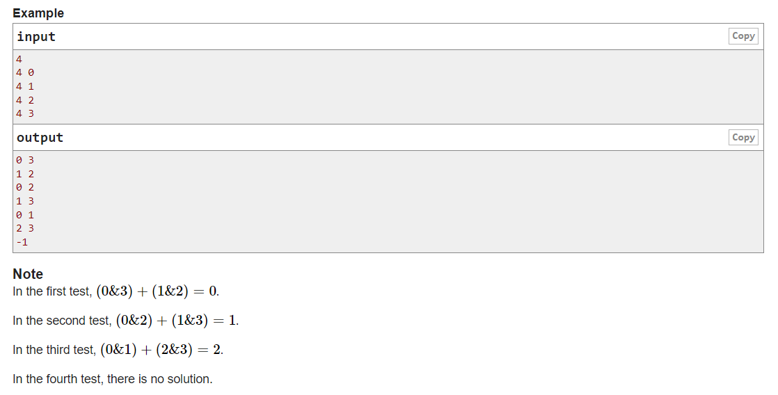 으로 설정할 수 있고, 두 수가 짝이 될 수 있는 이유는 &연산의 결과가 모두 0이기 때문이다. 또한 모든 수는 항상 자신의 짝이 존재하며 짝의 총 개수는 n/2개다.